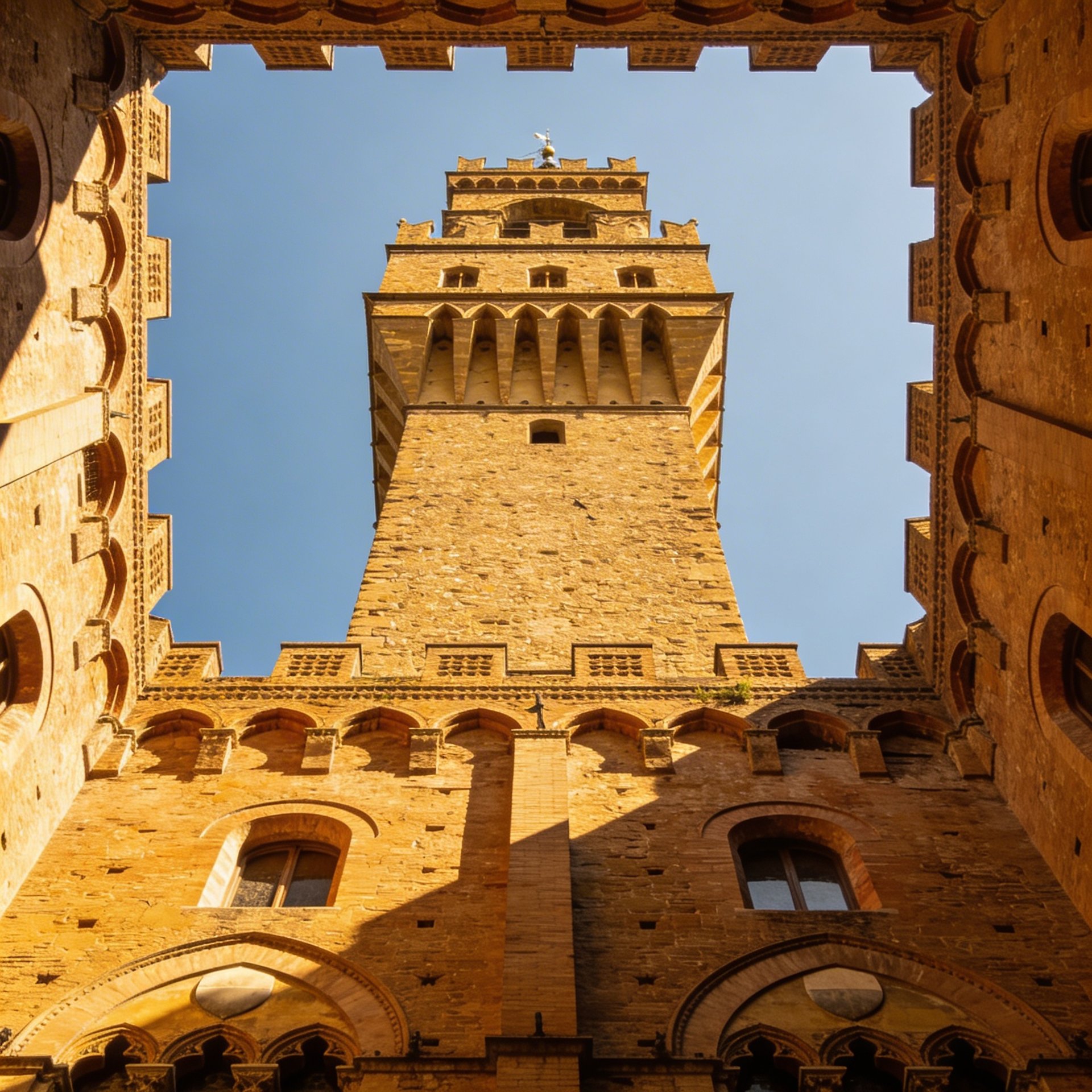 If you have ever seen a panoramic photo of the Florence skyline, chances are it was taken from the top of the Arnolfo Tower. Rising 94 meters above the Piazza della Signoria, this iconic stone sentinel is the highest point of Palazzo Vecchio and offers a vantage point that is unparalleled in the city.